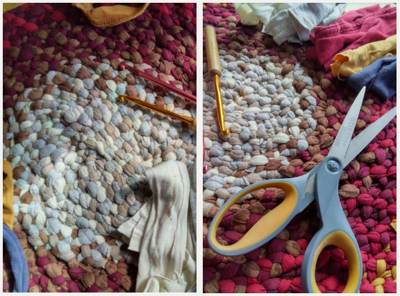 This is a project that can be as small or as large as you would like to create it. The end result is a squishy mat that feels wonderful under your feet, could protect your table from a hot pan, or could even hang on your wall. Crafted from excess material into a charming textile.